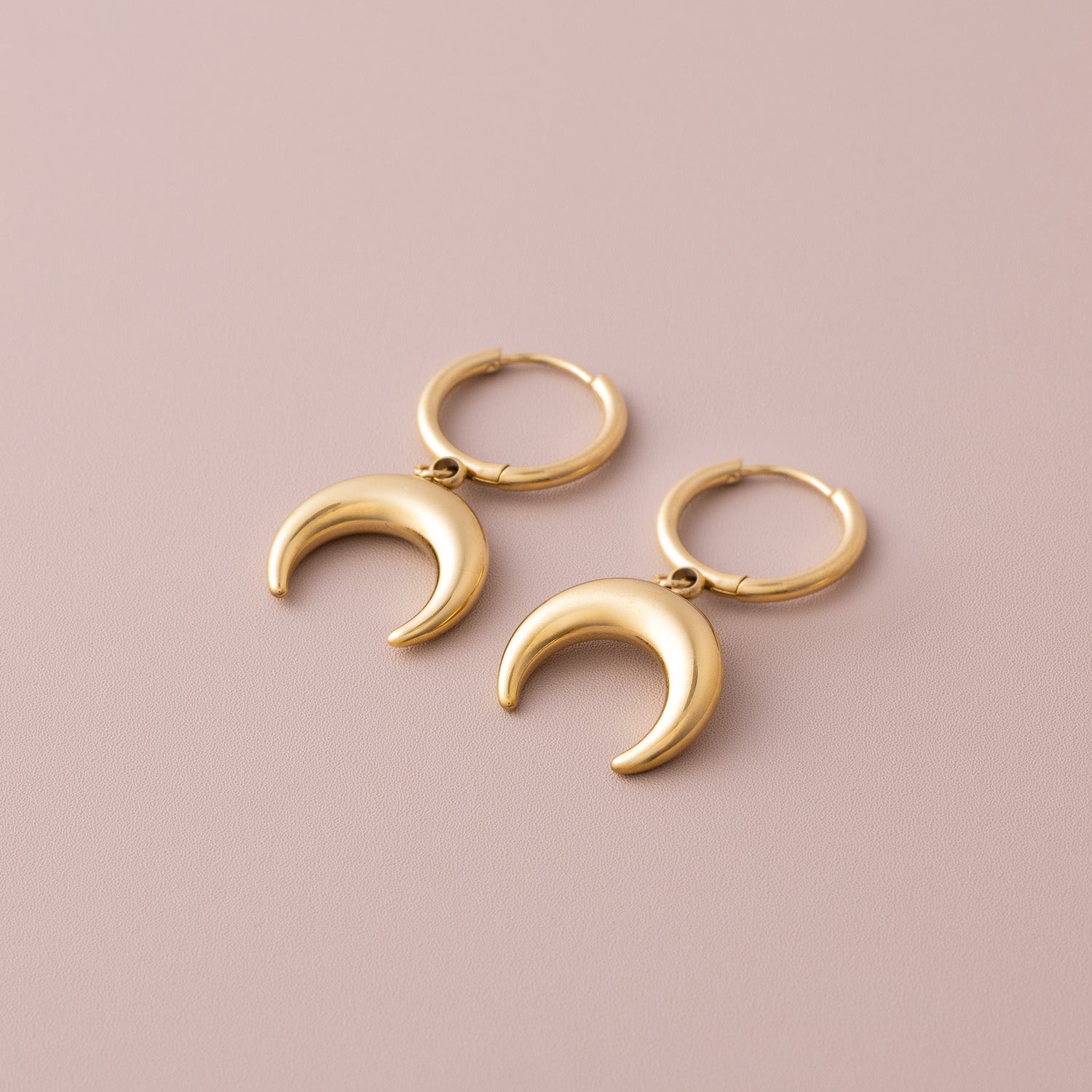 Minimalist stainless steel earrings featuring small, articulated horn-shaped drops.