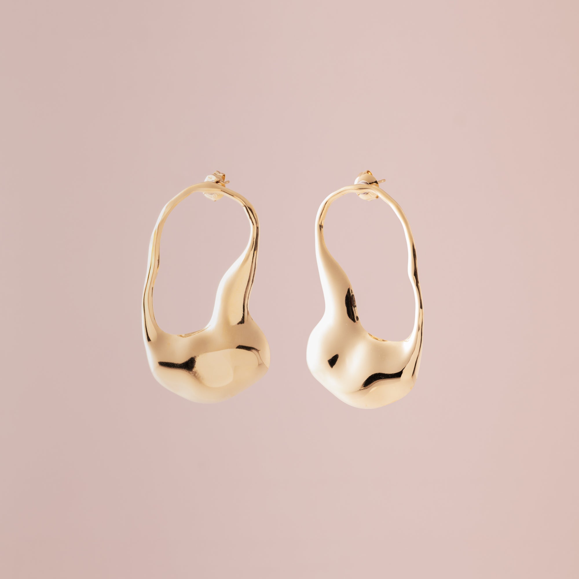 This pair of stainless steel drop earrings features an abstract, asymmetrical shape with a large opening near the top. The metal has a highly reflective, irregular surface with smooth curves, displaying a brilliant finish that resembles polished yellow gold.