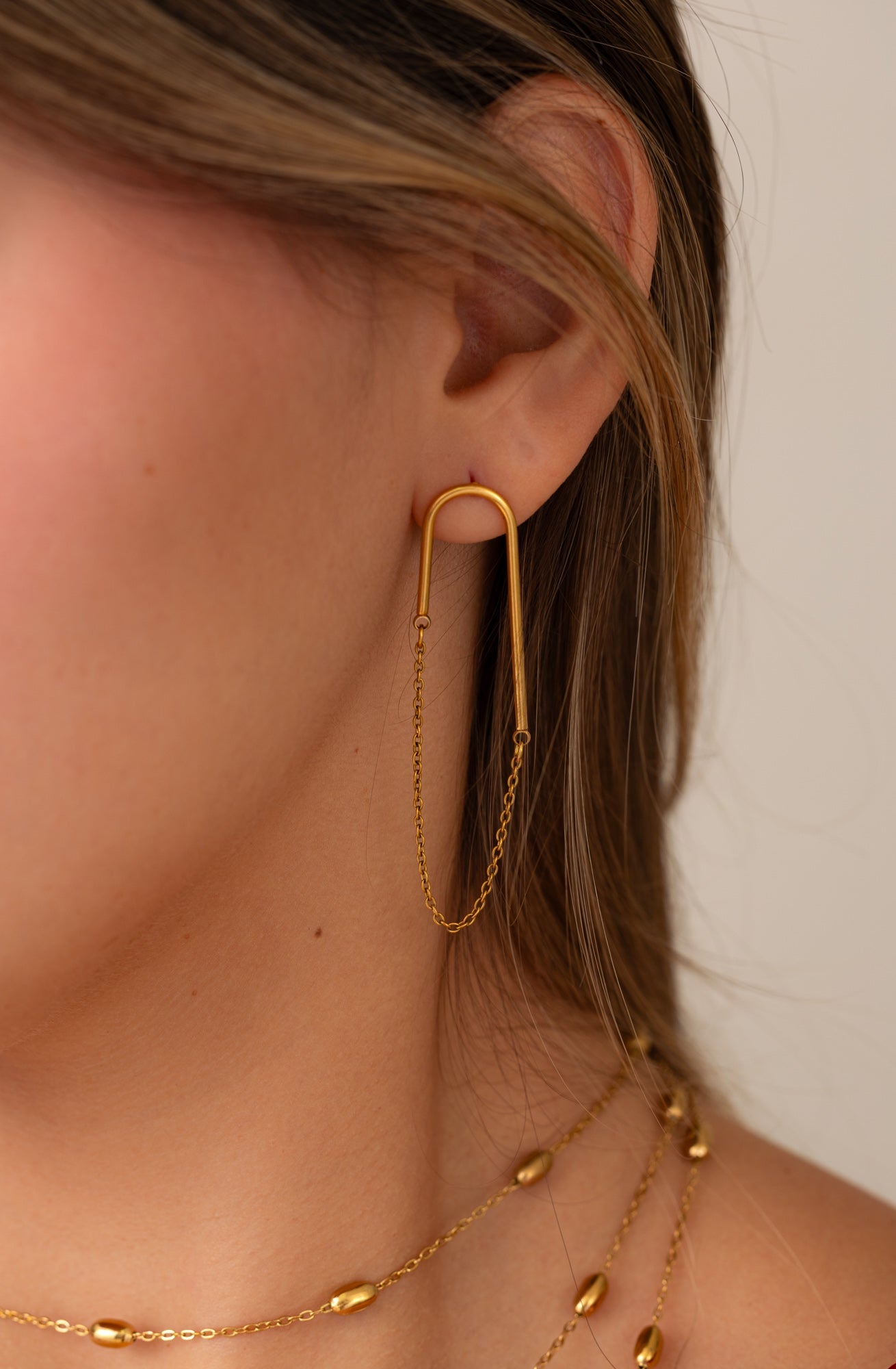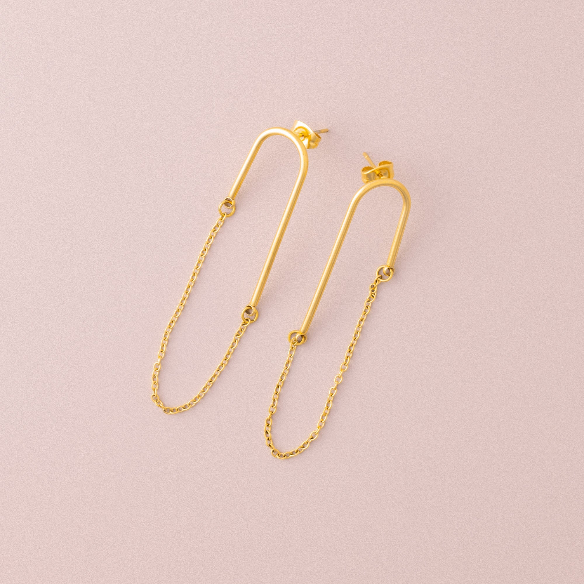 These contemporary stud earrings feature a sleek, elongated U-bar silhouette crafted from polished gold-toned stainless steel. The minimalist arch drops to connect with a delicate, free-flowing chain that swings gently below.