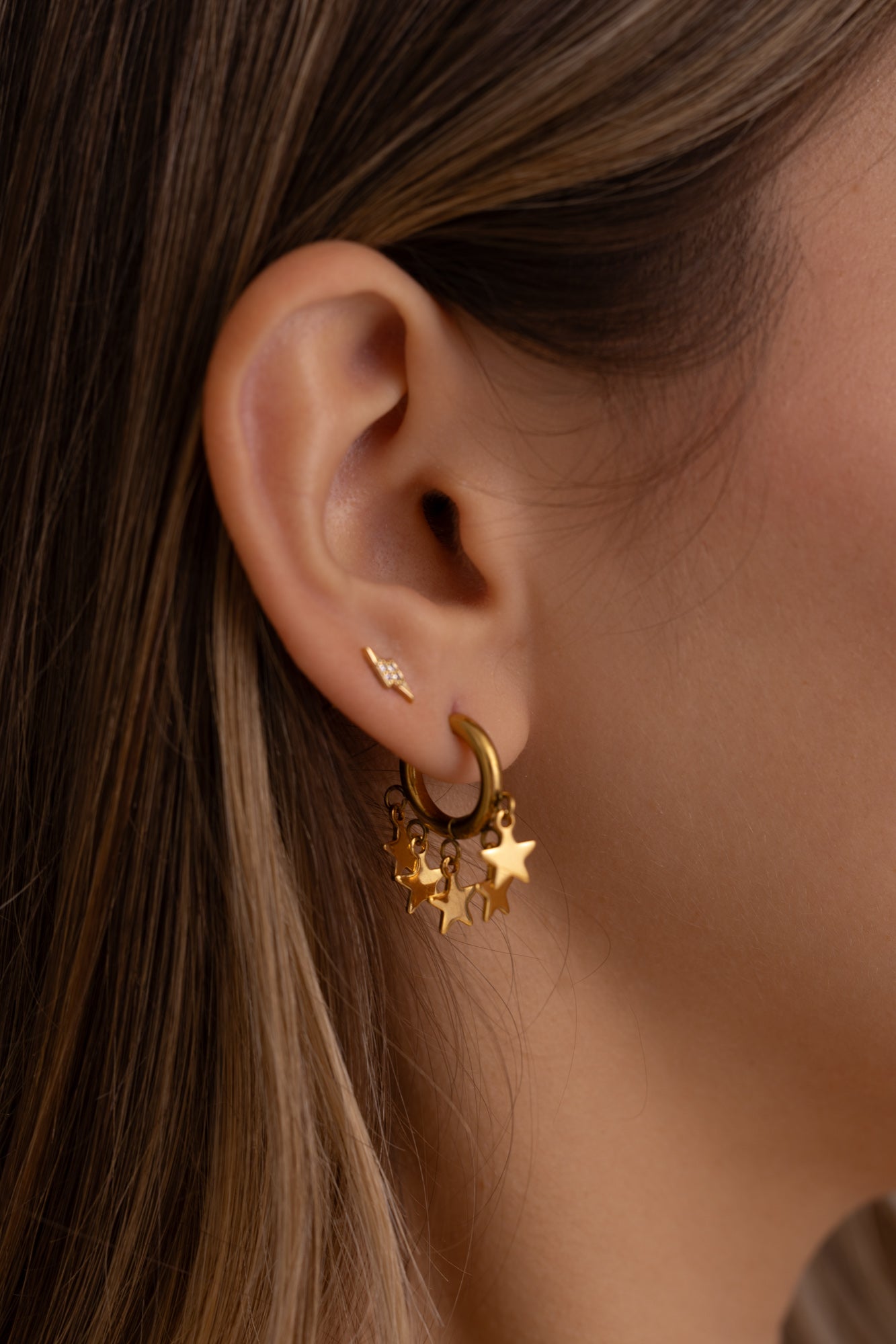 Stainless steel hoop earrings designed with multiple dangling star charms that add movement and detail to the classic hoop silhouette.