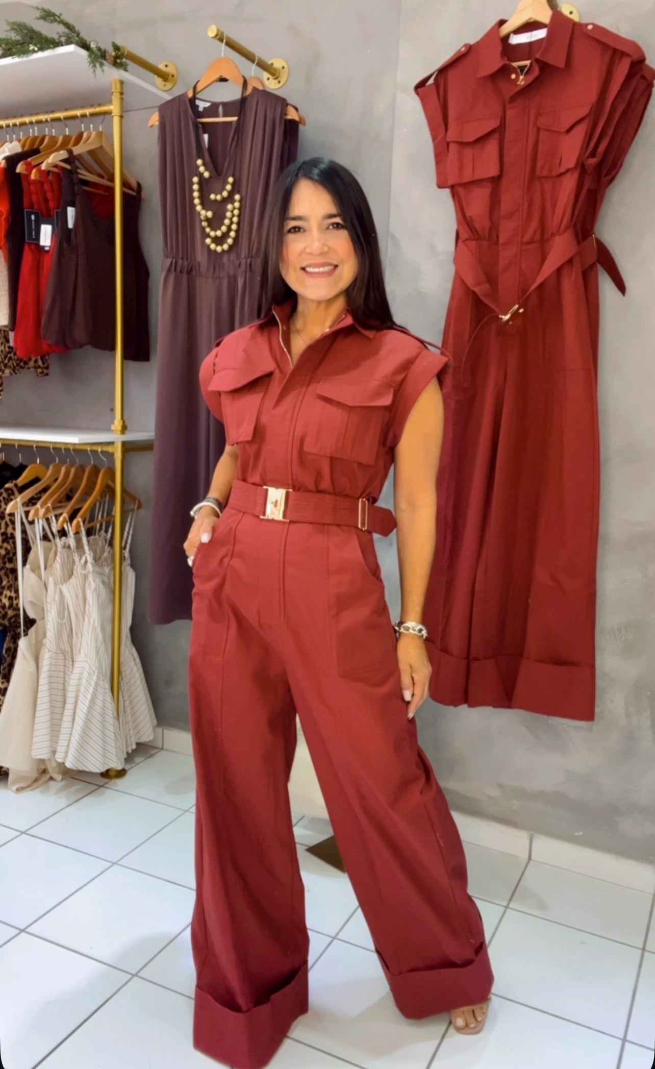 Step into effortless style with the Melanie Jumpsuit—your new go-to for looking put-together without trying too hard. This playful one-piece features a crisp collared top with practical chest pockets, cinched at the waist with a chic gold-buckle belt for instant definition. Wide-leg pants flow with a fun, flared vibe while the durable cotton-blend fabric keeps everything structured yet comfortable. Perfect for dressing up or down, this jumpsuit brings that cool, utilitarian edge with a dash of casual charm.