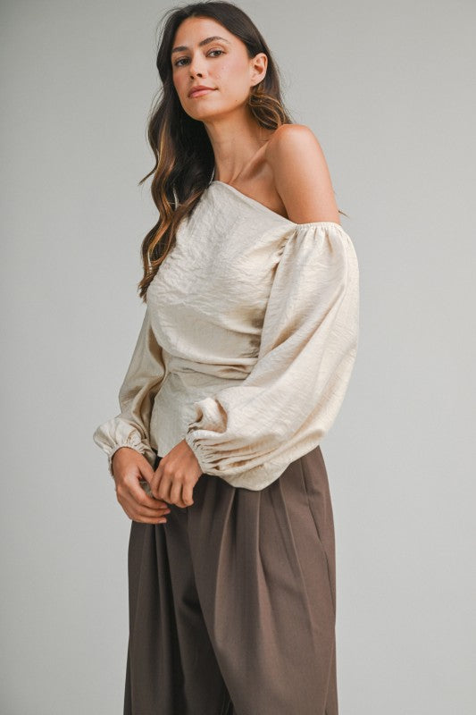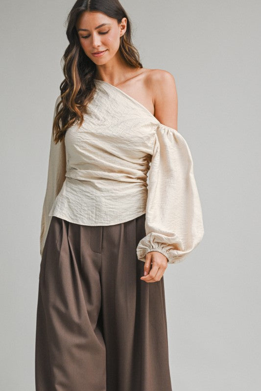 The Belle Top is your ticket to effortless elegance with a playful twist. This stunning piece features a chic one-shoulder neckline paired with dramatic balloon sleeves that command attention. The waist showcases gorgeous draped shirring detail on one side, creating a flattering silhouette that moves beautifully. A discreet invisible zipper keeps the look polished and seamless. Perfect for date night, special occasions, or whenever you want to feel absolutely fabulous.