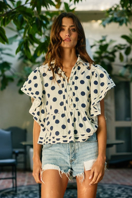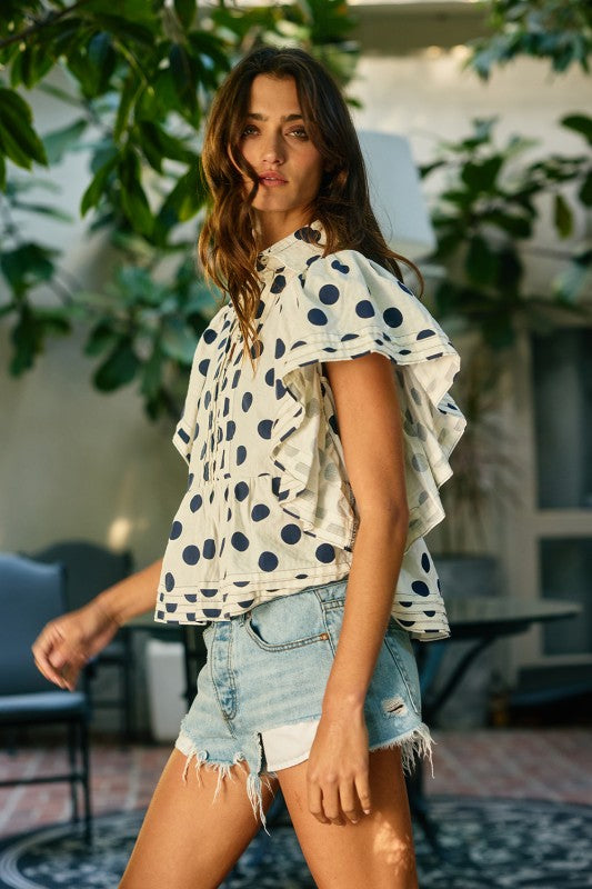 Twirl into the spotlight with the Celine Top, where vintage charm meets modern flair. This delightful piece features eye-catching polka dots that dance across the fabric, paired with romantic ruffle sleeves that add a touch of whimsy to any outfit. The pintuck detailing creates subtle texture and dimension, elevating this top from simple to sensational. Perfect for brunch dates, casual outings, or whenever you want to sprinkle a little joy into your wardrobe. A playful essential that brings personality and pizzazz to your everyday style.