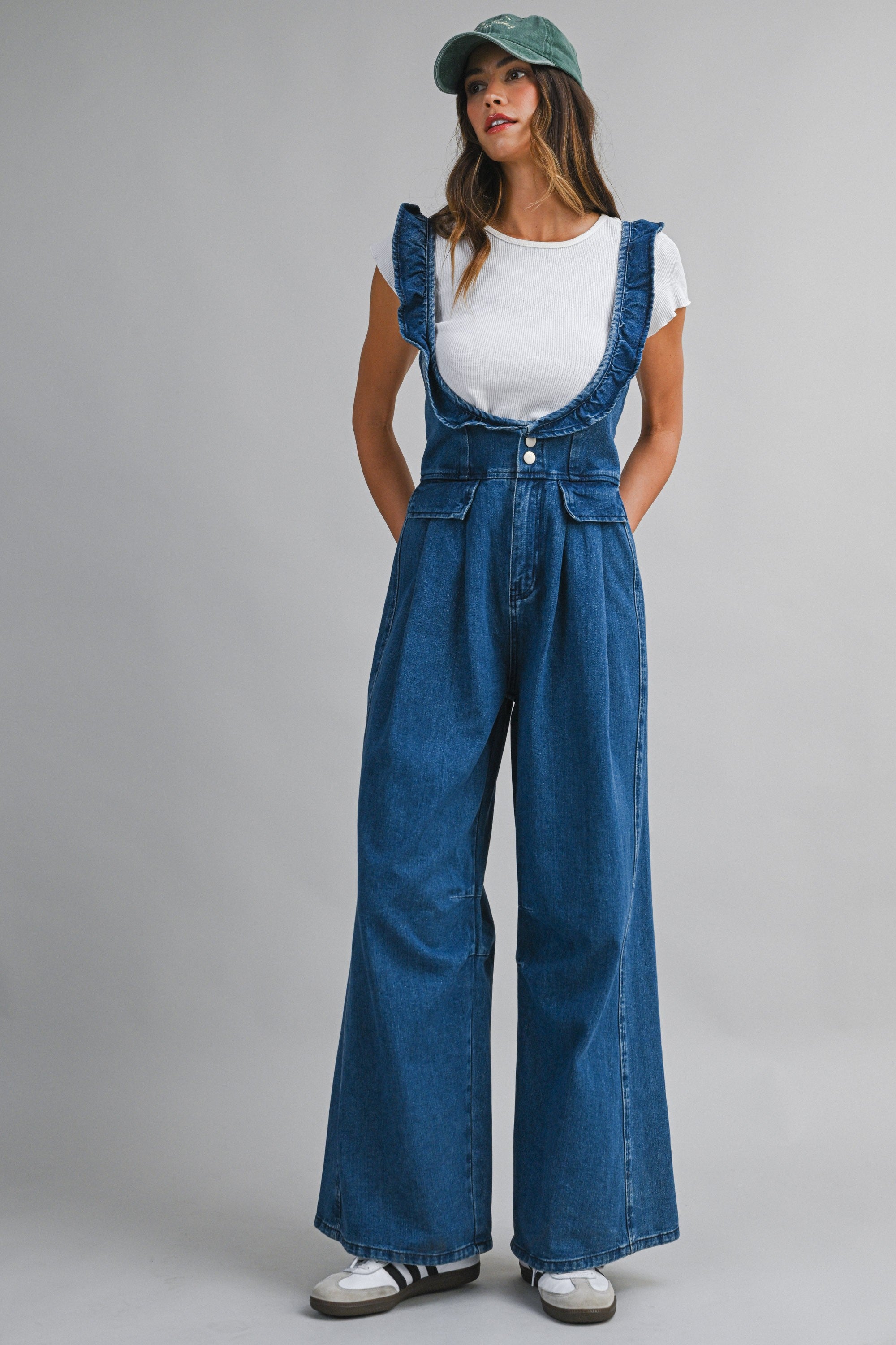 Effortlessly chic dark denim jumpsuit with a modern wide-leg silhouette. The ruffled adjustable shoulder straps and deep V-front neckline create a flattering, statement-making look. Adjustable crisscross back straps ensure a custom fit, while the button-front bodice adds classic appeal. Practical front and back patch pockets complete this versatile piece—perfect for dressing up or down.