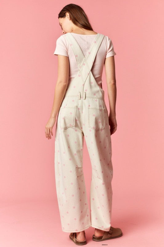 Lily Barrel Overall Rock a retro vibe with our playful polka dot denim barrel overall! This fun piece features a classic barrel silhouette with an all-over polka dot pattern that brings instant personality to any outfit. Perfect for casual days, weekend adventures, or making a bold fashion statement. The durable denim construction keeps you comfortable while the trendy barrel cut offers a modern twist on a vintage favorite. Style it solo or layer it up—either way, you'll turn heads!