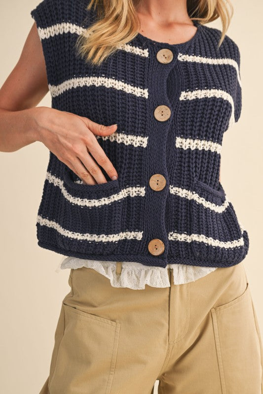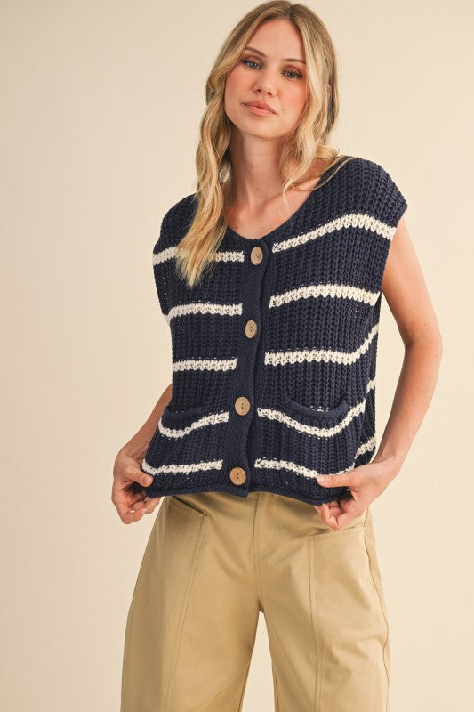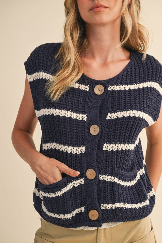 Elevate your style with the Mikaela Top, a bold take on the classic sweater vest. This sleeveless piece features daring stripes and button details that add an edge to any outfit. Designed to stand out, it pairs effortlessly with both casual and statement looks, making it your go-to for confident, fashion-forward dressing.